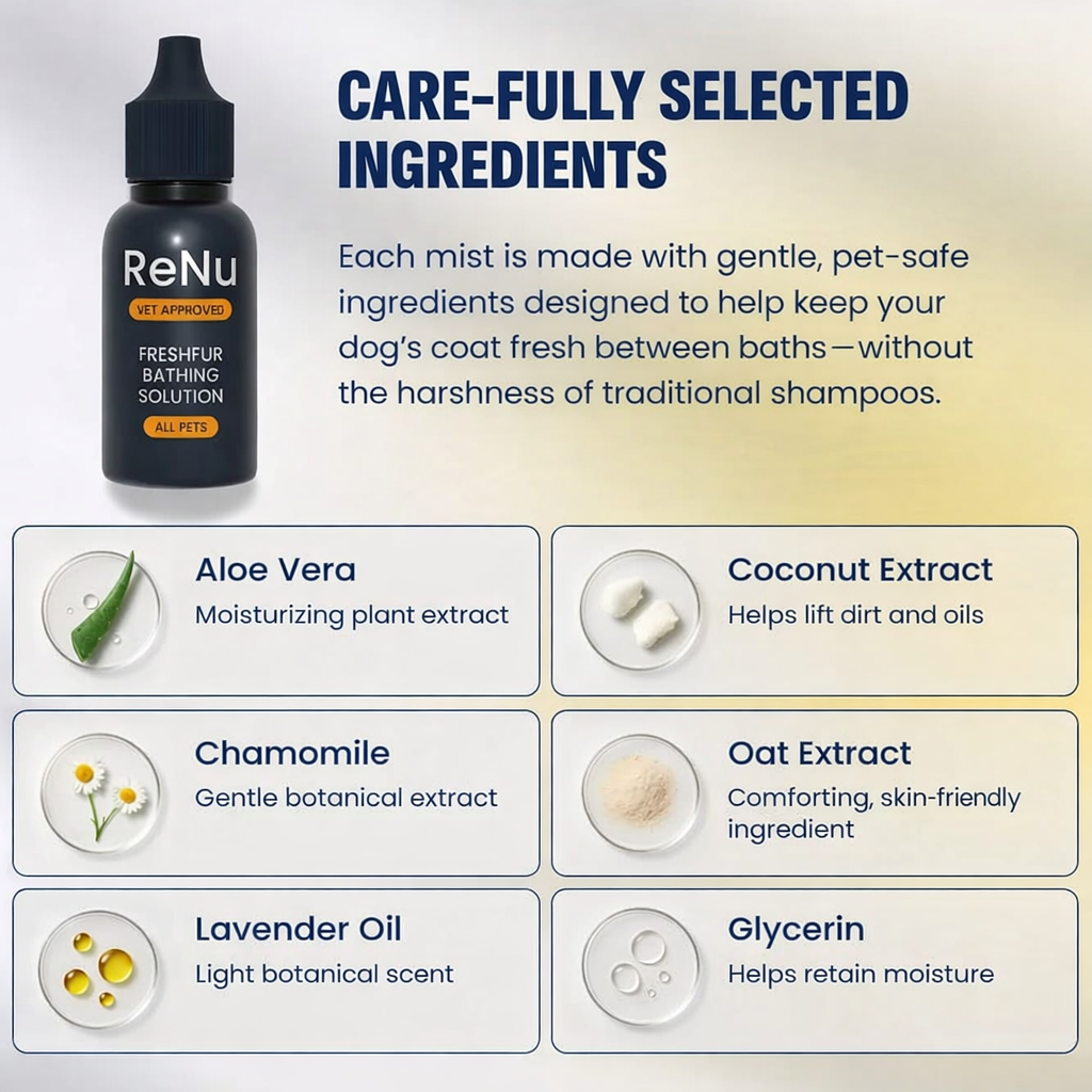 The FreshFur Bathing Solution contains natural, pet-safe ingredients like aloe vera, chamomile, and colloidal oatmeal to clean, soothe, and moisturize. It’s free from parabens, sulfates, and harsh chemicals.